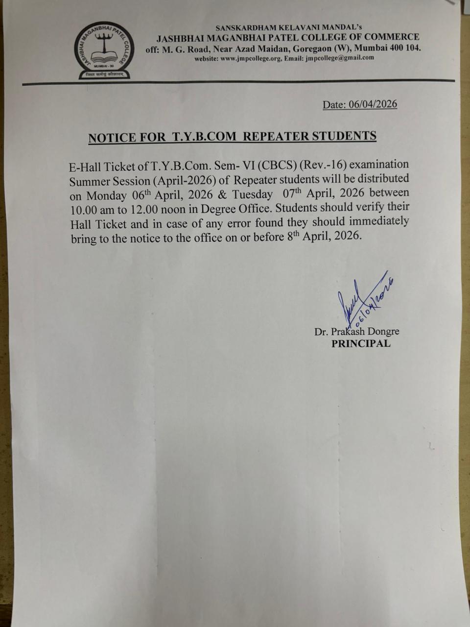 Hall Ticket TYBCOM Sem VI Repeater Students - Click here to View